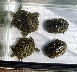 夏仕事から帰ると水槽内にいた亀全部が頭を上げ、口を開け餌をせがみよってきます。1匹1匹に自分の手から直接餌を与えますが、やっぱりその時が一番可愛いと感じますね...。 |
